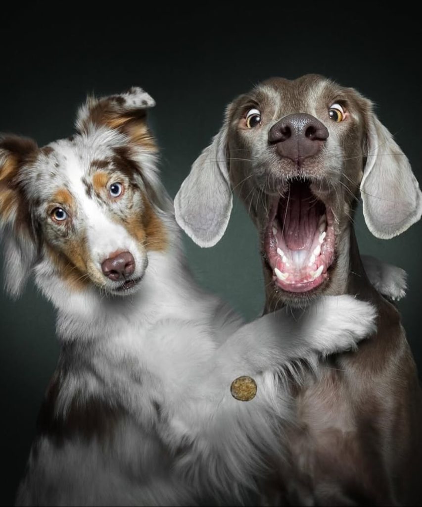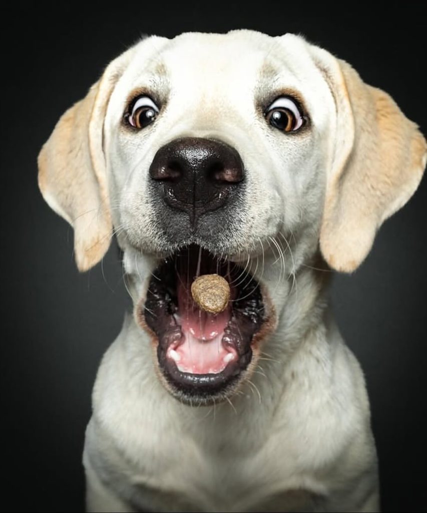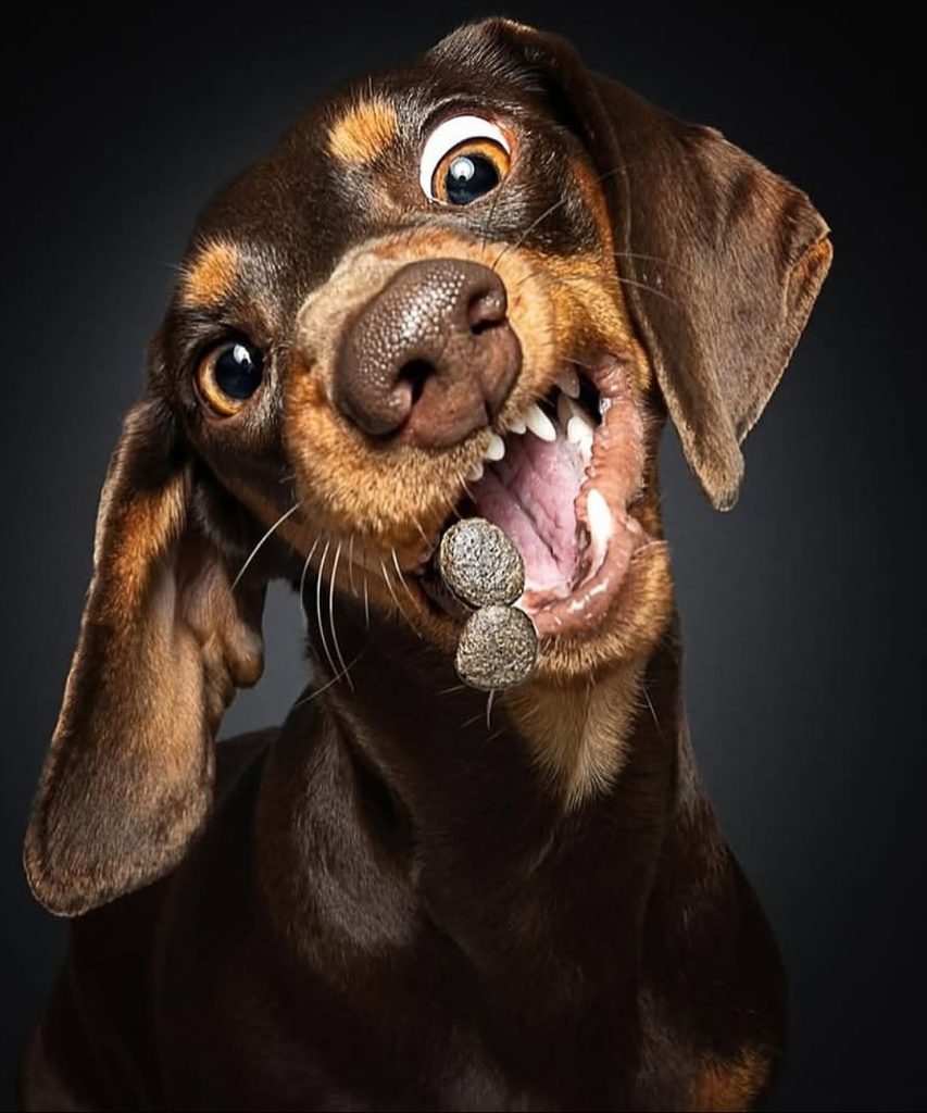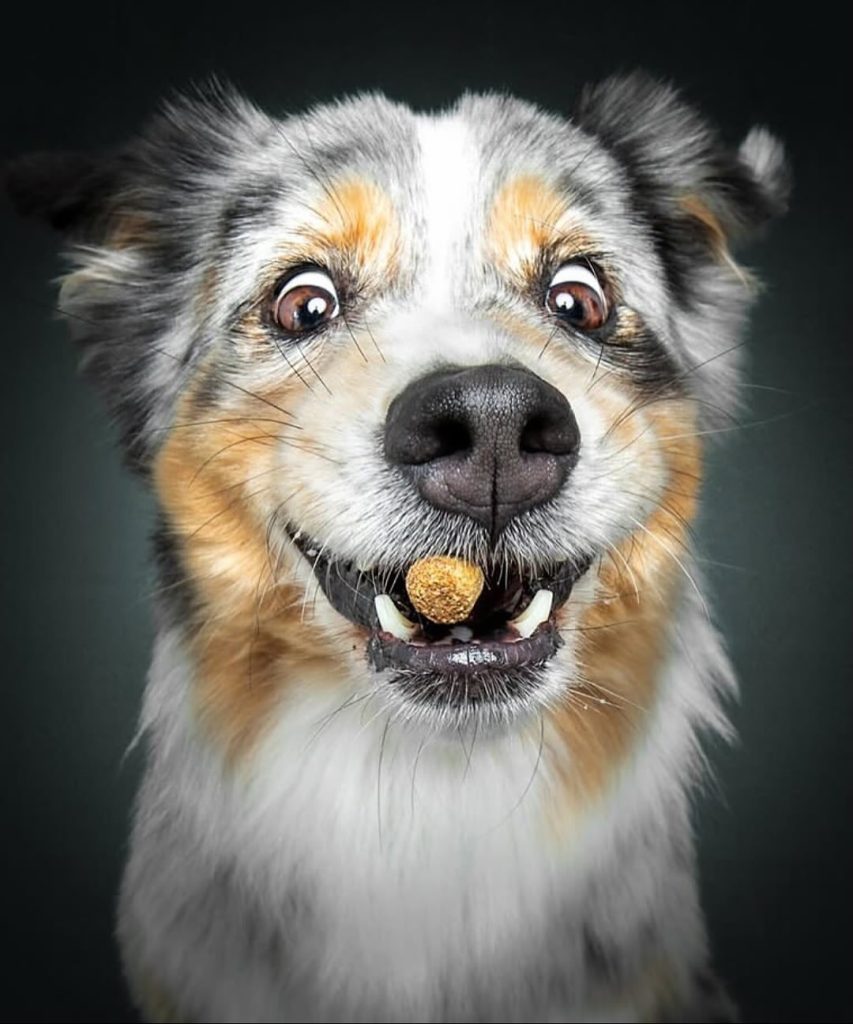 By 2016, the project had become so popular that Vieler decided to dedicate himself fully to it. He turned professional, opening his studio to dogs of all shapes, sizes, and breeds. Since then, he has photographed more than 2,000 dogs, each one bringing a unique personality to the frame. His setup is intentionally simple — a dark backdrop, a flash, and a tossed treat — because the star of the show is always the dog’s expression. From the tiniest terrier to the largest Great Dane, the reactions vary wildly: some look shocked, others determined, and a few seem to wear a look of complete confusion. Each one tells its own story.