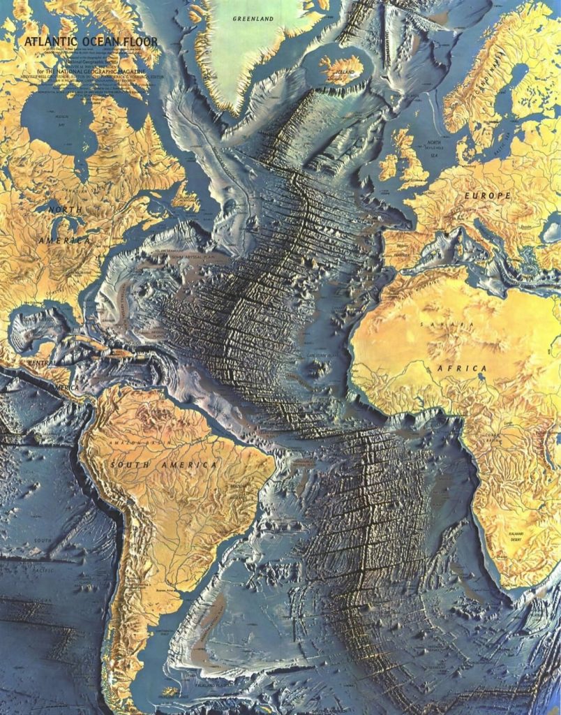 National Geographic turned their research into something breathtaking. Published between 1967 and 1971, the map was more than just data on paper—it was a visual masterpiece. Using bold colors and 3D-style shading, it transformed abstract numbers into an image that ordinary people could not only understand but feel. The ocean floor was no longer invisible. It was revealed as a rugged, dynamic world with peaks, cliffs, and endless ridges that stretched across entire oceans like scars marking the Earth’s skin. For many, this was the first time the concept of plate tectonics really came to life. You could literally see the Mid-Atlantic Ridge snaking down the globe, a clear sign that the Earth’s crust was shifting and reshaping itself over millions of years.
