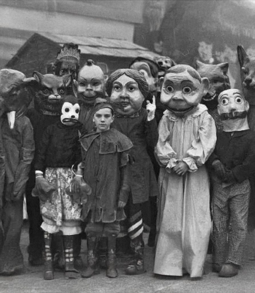 One glance at old photographs from the early 1900s is enough to send shivers down your spine. The people in those faded black-and-white images don’t look playful. They look like they’ve stepped out of a nightmare. Their masks were often crudely made from paper, burlap, or cardboard, cut and stitched together by hand without symmetry or polish. Some wore hollow-eyed masks that seemed lifeless, while others wore exaggerated noses, distorted mouths, or hollow, ghostlike expressions that made them far scarier than today’s plastic masks. These costumes weren’t designed to be Instagram-ready. They were simple, homemade disguises, and it’s exactly that raw, unfinished quality that makes them so haunting to look at now.