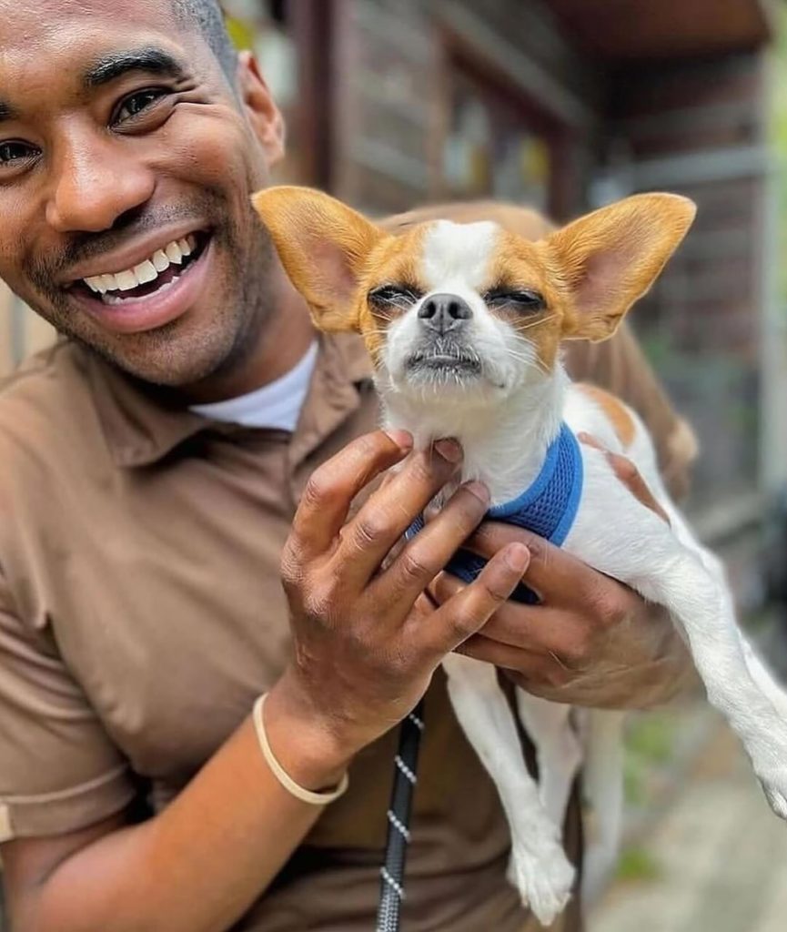When you look through the collection of his photos, you notice the variety of dogs he encounters. Big dogs, tiny puppies, scruffy mutts, and perfectly groomed show dogs—each one is different, and yet the joy in each picture is the same. It doesn’t matter if it’s a nervous little Chihuahua or a boisterous Golden Retriever; every dog brings its own kind of light to the photo. That inclusiveness, the willingness to love them all equally, mirrors what so many of us want from the people in our own lives: to be accepted as we are, without judgment, with open arms and a smile.